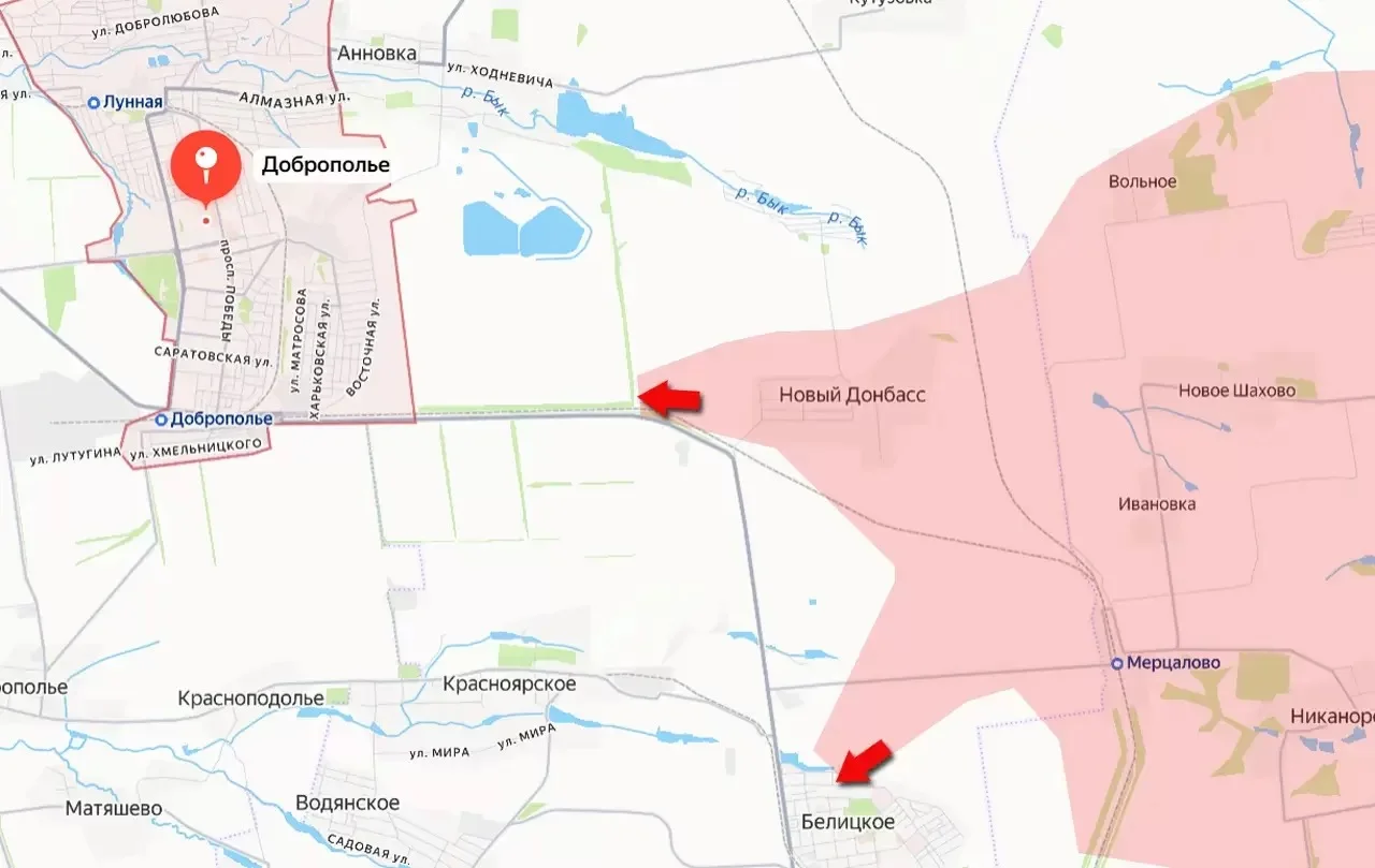 Российские подразделения вышли к лесопосадке примерно в двух километрах от Доброполья — одного из ключевых логистических узлов ВСУ в этой части Донбасса. Штурмовые группы при поддержке артиллерии и операторов БПЛА достигли железнодорожной и автомобильной дорог, соединяющих Доброполье и Белицкое. Таким образом, коммуникация между этими городами существенно осложнена.