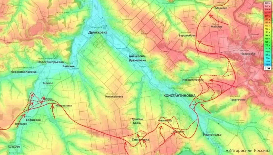 Наступательные действия развиваются сразу по нескольким направлениям — на юге, юго-западе, востоке и юго-востоке города. В центральной части Константиновки идут ожесточённые столкновения, которые эксперт охарактеризовал как «большое сражение». Российские подразделения действуют малыми мобильными группами, постепенно закрепляясь в застройке и накапливая силы.
